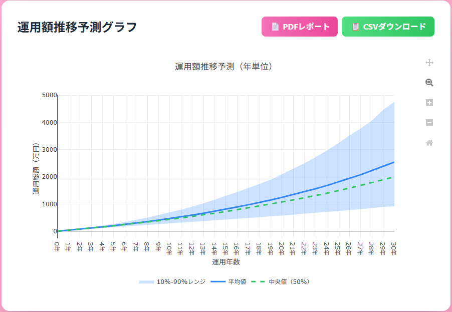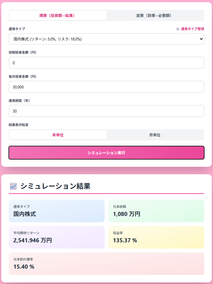 → 元本割れ確率を確認。債券なら低リスク、株式なら高リターン・高リスク。自分のリスク許容度に合わせて選べます。