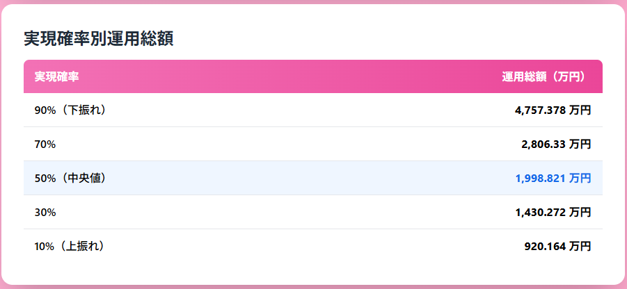 | 50%(中央値) | 半分の確率でこの金額以上になる=中間シナリオ |